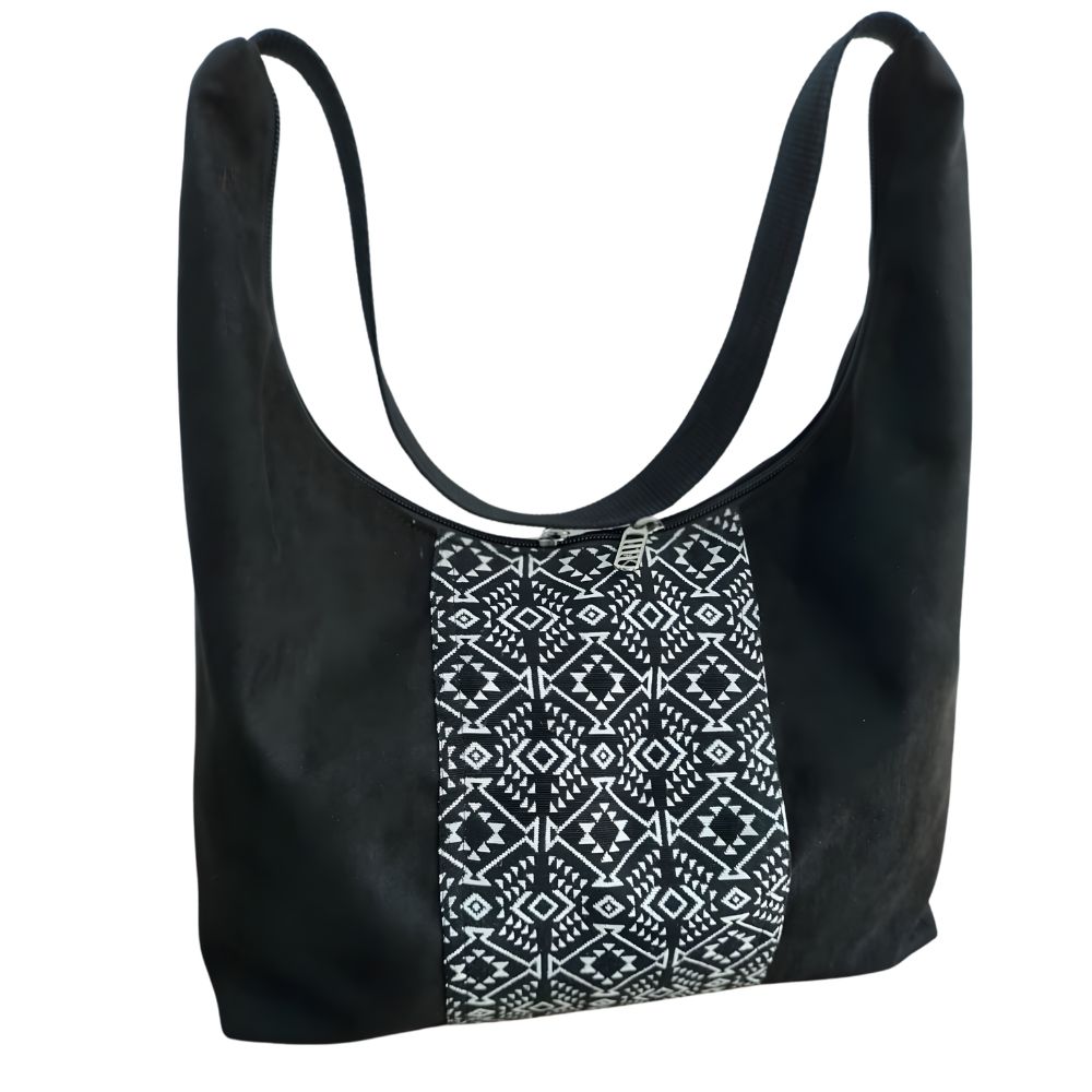 Elegancia que impone estilo. Este bolso negro, hecho 100% a mano, destaca por su estampado central de patrones de figuras que aportan un toque moderno y sofisticado. Con cierre seguro y diseño versátil, es perfecto para llevar tus esenciales con actitud.